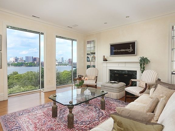 FURNISHED 3 PLUS bedroom, 2.5 bath duplex with private deck and tandem garage parking space with truly sensational river AND city views! Positioned in an elevator building, this unit features an open concept, elegant living space with large living/dining room and captivating floor to ceiling windows overlooking the Charles River. Well-equipped eat-in kitchen with banquette offering all the necessary essentials for a comfortable stay. Large, sunny, family room / "den" on the upper level of this duplex condo with more sensational river and city views, access to the private deck, and a half bath. This spaces is also perfect for a little privacy or home office needs. Primary bedroom w/ ensuite bath, and 2 additional bedrooms sharing a full marble bath. The unit has tasteful furnishings, kitchen basics, and has been beautifully maintained. One interior tandem garage parking space is available w/ the unit. In-unit laundry, central air. Since the unit is furnished, pets are not allowed.