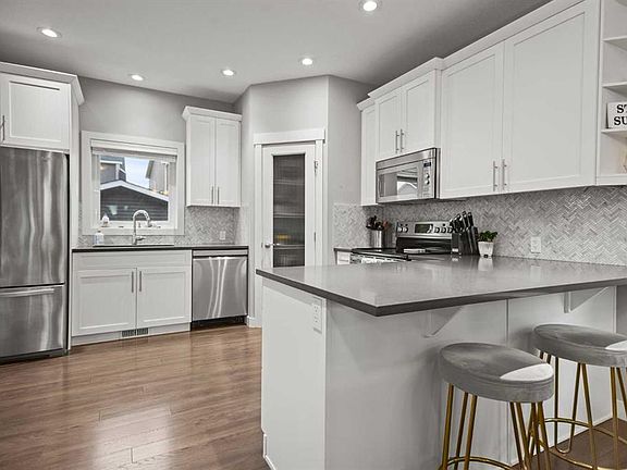 Welcome to 412 Evanston Way NW – a beautifully upgraded and FULLY DEVELOPED detached home offering over 2,200 SQ.FT of stylish living space in one of Calgary’s most sought-after, family-friendly communities. Perfectly positioned just steps from schools, parks, playgrounds, and everyday amenities, this home combines comfort, function, and TIMELESS DESIGN. The bright, open-concept main floor showcases a welcoming living area centered around a cozy gas FIREPLACE, flowing seamlessly into a designer kitchen with crisp white shaker cabinetry, a modern HERRINGBONE backsplash, extended breakfast bar, walk-in PANTRY, and a full stainless steel appliance package. A tiled front foyer and rear mudroom add everyday convenience and organization for busy family life. Upstairs, discover three generous bedrooms, including a serene west-facing primary retreat featuring a spa-inspired ensuite with DUAL SINKS, soaker tub, glass walk-in shower, and a spacious walk-in closet. The upper level also includes a 4-piece main bath and a convenient laundry room. The professionally finished basement, completed in recent years, extends your living space with a large family or recreation area, a beautiful full bathroom, and a fourth bedroom—ideal for guests or growing families. Step outside to enjoy the sunny west-facing backyard and an OVERSIZED double garage, offering plenty of room for vehicles, tools, and storage. Set in the heart of Evanston, this home offers a true sense of community with lush green spaces, walking paths, and quick access to Evanston Towne Centre and Creekside Shopping Centre. This is move-in ready living at its finest—close to everything and perfectly connected via Stoney Trail for effortless commuting across the city.