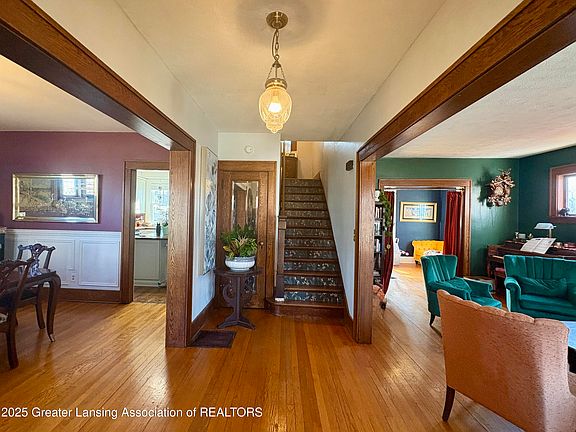 Welcome to 412 E. Jefferson St, a timeless 1920 brick home in the heart of Grand Ledge's historic River ledge District. Offering 4 bedrooms, 2.5 baths, and a large fully fenced yard, this residence blends historic charm with thoughtful updates. Step inside to find gleaming hardwood floors, a cozy living room with a wood-burning fireplace, a separate den, a beautifully remodeled kitchen, main floor laundry, and a spacious dining room for gathering. Upstairs, you will find four bedrooms, an updated full bath, and an inviting sleeping porch filled with morning light. The partially finished basement boasts an additional full bath, high ceilings, and many additional spaces for storage or a workshop area. Set along one of Grand Ledge's most beloved tree-lined streets, this home captures the character and pride of the community. Known for its stunning sandstone rock ledges along the Grand River, Grand Ledge offers unmatched natural beauty and outdoor recreation. Just blocks away, Fitzgerald Park features scenic trails, historic ledges, and family-friendly spaces, while the newly renovated Jaycee Park is a short 5-minute walk away. Charming downtown Grand Ledge is just four blocks away, boasting unique shops, local eateries, and annual festivals that bring neighbors together. You will appreciate Grand Ledge public schools and the short commute to Lansing or Grand Rapids. If you are seeking home with history, warmth, and space to grow, set in a welcoming community rich with character, this is the one. Don't miss the chance to make it yours.