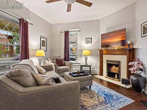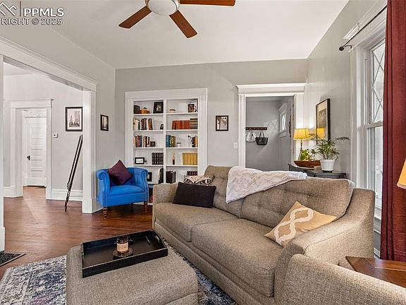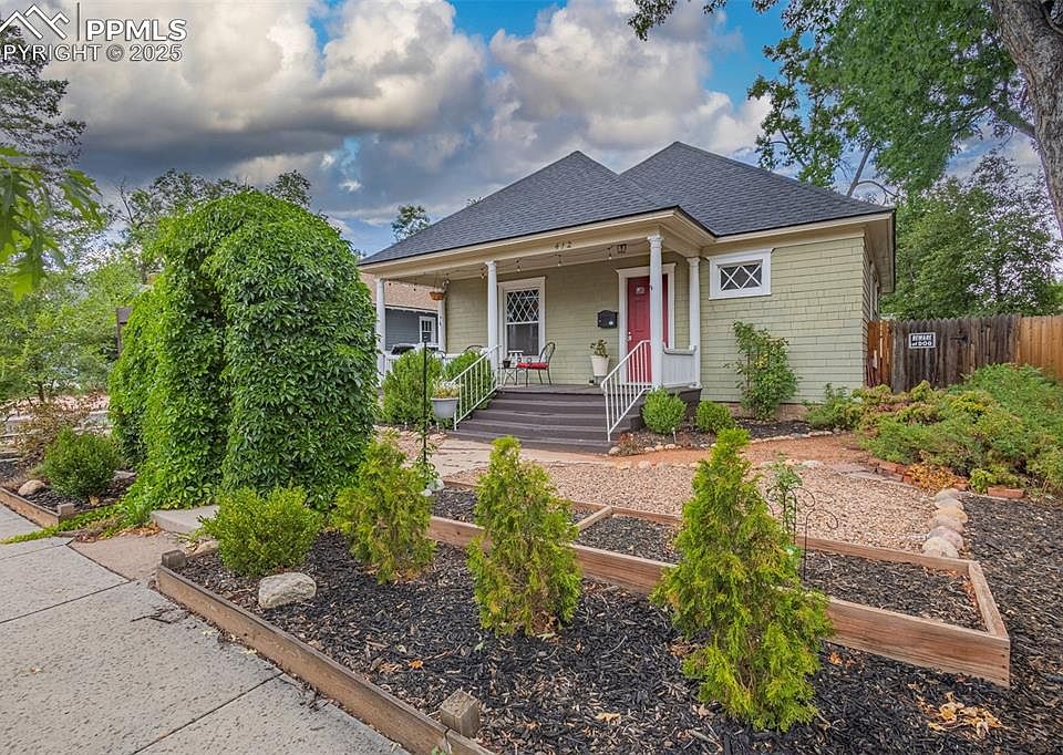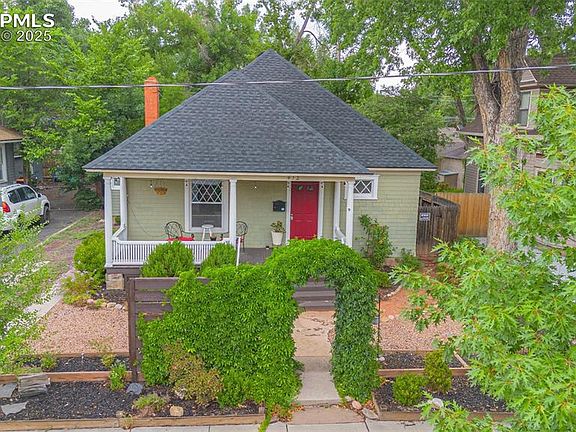 Absolutely stunning from the outside in, this home is a true gem! The location is superb. You're just steps from the Colorado College campus, one mile from the Patty Jewett golf course, and two miles from enjoying everything the downtown area has to offer. The meticulously maintained exterior boasts beautiful landscaping, a privacy fence, and a spacious front porch. For parking, no need to park on the street, there’s a driveway on the side of the home.. As you step through the front door, a mudroom to your right provides a perfect spot to unload shoes and hang coats. To your left, the living room welcomes you with a cozy wood-burning fireplace and a stylish built-in bookshelf. The entryway leads you to a bright dining area, illuminated by bay windows and a beautiful chandelier. This space also features built-in seating with storage and a charming re-finished bar. A hallway off the dining room provides access to two spacious bedrooms, including a main bedroom with a walk-in closet. Also along the hallway is your fully remodeled bathroom. The dark paint color meshes perfectly with the hexagon floor tiles and the floor to ceiling bright white shower tiles. A highlight of the home is the versatile sunroom, located just beyond the dining room, offering endless possibilities. Adjacent to the sunroom is the kitchen, complete with stainless steel appliances, granite countertops, and a tiled backsplash. From the kitchen, steps lead down to the basement, where you'll find the washer and dryer, storage space, and a sitting area. The backyard is truly an entertainment oasis, fully enclosed with a privacy fence. It features two large sheds, a concrete space perfect for outdoor dining, and plenty of room for activities. Don’t miss out on this incredible home!