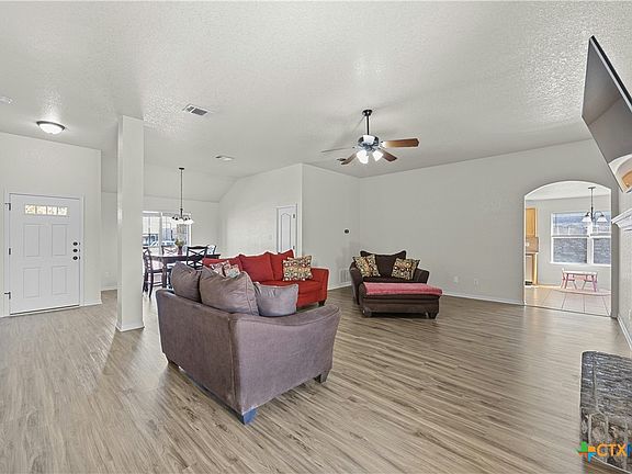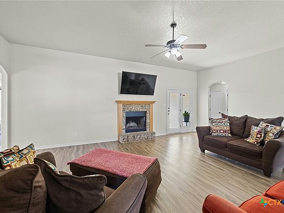 Welcome to 412 Leo Lane, a charming 4-bedroom, 2-bathroom home in the heart of Killeen, Texas. This spacious residence features a well-designed split floor plan, with the master suite thoughtfully located on one side for privacy and three secondary bedrooms on the other. The open living area boasts tall ceilings and a cozy wood-burning fireplace, creating a warm and inviting atmosphere. The kitchen offers ample space for dining and is complemented by a formal dining room that can be used as a flex space to suit your lifestyle. Step outside to enjoy the covered patio and private backyard, perfect for relaxing or entertaining. The home has been freshly painted and offers great curb appeal. Conveniently located just 2 miles from the Trimmier H-E-B Plus, the home is also near a variety of dining options, shopping centers, and fitness facilities. Notably, TruFit Athletic Club on Ft. Hood Street provides top-of-the-line equipment and amenities for your workout needs.