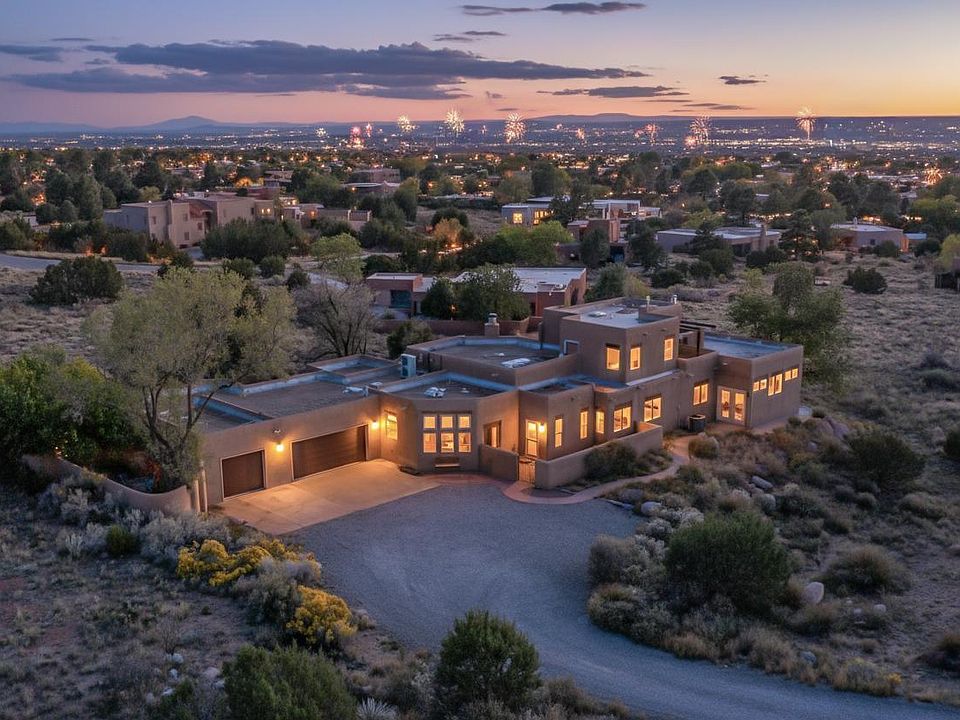 **Open House Sunday 10/26, 1-3 PM.** Discover this charming residence on 1.1 acre nestled in the scenic foothills of Sandia Heights, blending the beauty of panoramic city & mountain views. This inviting home features clearstory windows enhanced with custom stained glass, bathing the interiors in natural light. The kitchen is designed for culinary enthusiasts, boasting ample cabinetry & a well-sized pantry, complete with an induction cooktop. Perfect for entertaining or quiet nights at home, the fully landscaped backyard is equipped with a built-in fountain & a Viking outdoor BBQ. On the upper level, the primary suite offers a sanctuary & stunning views. The main house offers three well-appointed bedrooms, plus a versatile casita with a bedroom, living area & 3/4 bath.