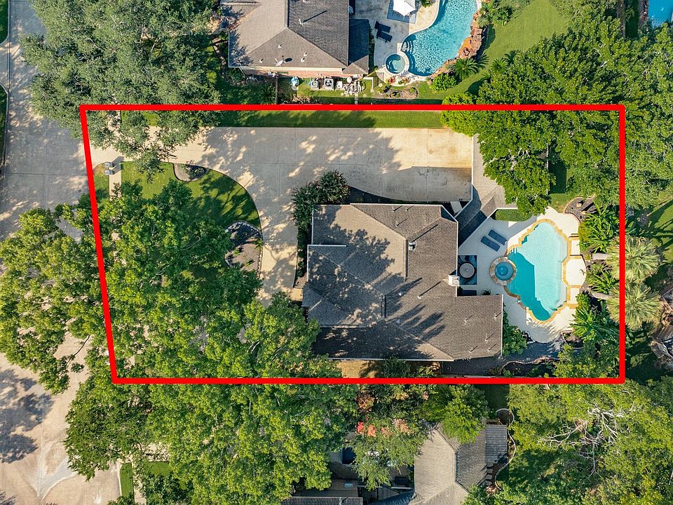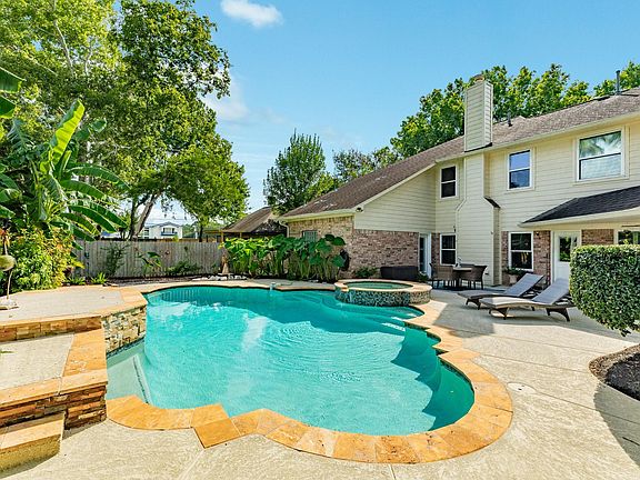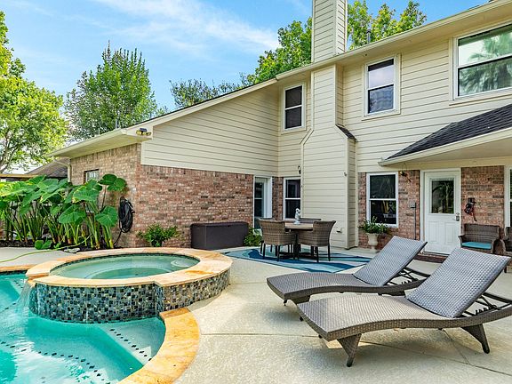 Welcome home to this stunning two-story brick residence framed by majestic trees and manicured landscaping. A circular driveway creates a graceful entrance, leading to a home that blends elegance, comfort, and resort-style living. The expansive lot offers privacy within a quiet, tree-lined neighborhood. Step into your own oasis featuring a sparkling pool, raised spa, and lush tropical landscaping. Inside, the open layout boasts soaring ceilings, abundance of windows allowing natural light, a family room with dramatic stone fireplace and oversized windows showcasing the backyard retreat. The chef’s kitchen impresses with rich espresso cabinetry, granite counters, central island, and custom stone backsplash. The luxurious primary suite features tray ceilings, crown molding, and tile flooring, while the spa-inspired bath offers dual vanities with granite, copper sinks, soaking tub, and oversized walk-in shower. A true blend of style, function, and timeless appeal awaits.