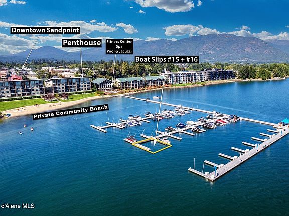 Discover the ultimate expression of refined waterfront living in this rare double penthouse residence at Seasons at Sandpoint. Encompassing 4,255 square feet of beautifully crafted interiors with soaring ceilings and a grand staircase connecting the home's elegant living spaces, this exceptional home showcases 4 bedrooms and 4 bathrooms, along with two main-floor living areas—one enhanced by a hidden theater screen—creating an atmosphere of both grandeur and warmth. The gourmet kitchen is a centerpiece of the home, highlighted by copper-wrapped beams, custom copper accents, and an extensive island with breakfast bar seating. The spacious lakeside dining area and two balconies create the perfect setting for entertaining or relaxed everyday living. Upstairs, a large loft area welcomes you with incredible panoramic lake views. The den includes a wet bar and a large flex area beyond, perfect for a home gym or additional sleeping quarters. The primary suite on this level is a true sanctuary, offering generous proportions, a spa-inspired bathroom with soaking tub and walk-in shower, and an oversized walk-in closet with built-in sauna. Additional highlights include two side-by-side 30 FT boat slips for effortless lake access, two heated parking spaces with roll-up storages. Residents also enjoy full access to Seasons premier amenities such as their award-winning spa, lakeside pool, hot tub, fitness center, and concierge services. Designed for those who demand exceptional quality and comfort, this one-of-a-kind home showcases breathtaking lake views and unforgettable sunsets. This exceptional offering combines thoughtful design, privacy, and resort-style amenitiesan extraordinary opportunity at The Seasons at Sandpoint.