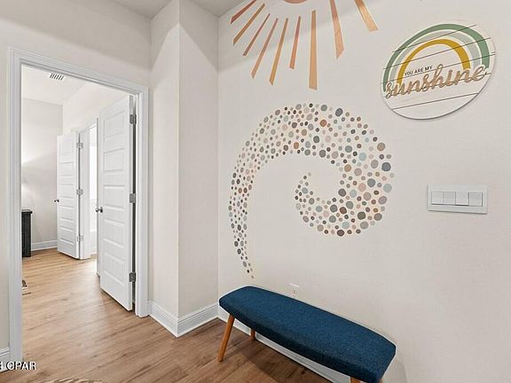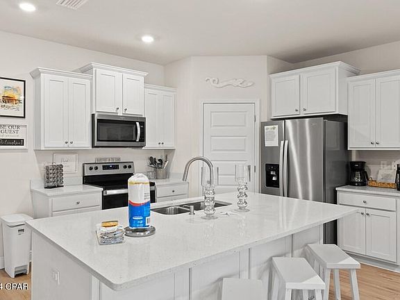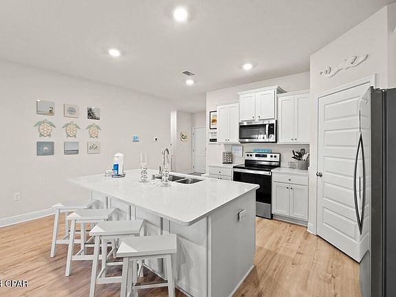 INVITING 4BD/2BA HOME WITH WATER VIEWS IN THE COVETED COMMUNITY OF WINDMARK BEACH! Must see one level living at its finest offering a comfortable & spacious open concept design. Positioned on a premium water view lot, this beautifully crafted home provides a range of sought after features. Luxury vinyl plank flooring & 9' ceilings extend the entire space creating an open & airy atmosphere. Trey ceilings in the living area & primary suite along with 5'' base molding adds an extra touch of modern elegance. Durable granite counters & designer lighting are included in the kitchen & bathrooms in addition to custom cabinetry, breakfast bar seating, walk-in pantry & stainless steel appliances. Conveniently located off the dining area is a covered patio overlooking the water perfect for grilling and cocktails at sunset. Wake to a water view in the primary suite complete with a walk-in closet, garden tub, separate shower & double vanity. Three additional bedrooms & a nicely appointed full bath finish the layout. Newly constructed in 2022, enjoy maintenance free four-sided Hardie siding and front entry garage for covered parking and added storage. A golf cart community all its own, Windmark Beach amenities include a community pool, day docking, bike trail & walking paths. Visit the town center for waterfront dining, mercantile shops & fitness center. Boardwalk beach access leads to white sand pet friendly beaches for shoreline fishing, kayaking & more are all just a short walk away! Offered fully furnished and rental ready, this home is already an income producing property making this home an ideal investment or full-time residence. Take the 3D tour and call today for a showing!