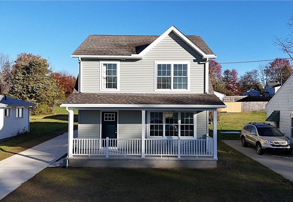 This newly constructed 1,409 square foot, three-bedroom, two-bathroom home features a sprawling front porch, spacious open concept living, dining, and kitchen area, first-floor laundry, and a detached two-car garage. The full basement is both waterproofed and insulated. Refrigerator, range, microwave range hood, dishwasher, washer, and dryer are included with purchase.