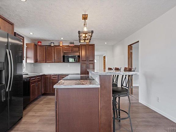Remodeled home with lots of updates! At the entrance to the home is a covered porch that leads to the open concept living room & kitchen. The living room has been updated with new paint and fixtures. The kitchen features new cabinets with ample storage space, updated fixtures, dark stainless appliances, a matching island with additional storage. One of the bedrooms features an updated, full en suite bathroom that has been completely remodeled. Off the kitchen is the main floor laundry room and an additional updated half bathroom. The basement offers additional storage space and an additional egress via a staircase that leads outside to the side of the house. The back yard features a fenced-in back yard with a tall wooden privacy fence. The 2-car detached garage features 2 automatic overhead doors, a permanently affixed electric heater and air lines that can be connected to an air compressor.