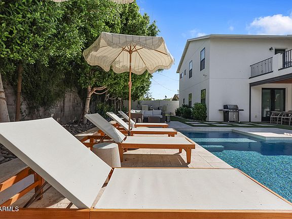 Stunning Arcadia Osborn Residence - modern design & resort lifestyle. Every detail of this 4-bedroom, 3.5-bath home plus office and loft has been thoughtfully crafted for both style and comfort. From the inviting front porch and private courtyard to light-filled interiors wrapped in wide-plank oak flooring and custom accent walls, the design blends warmth with contemporary elegance. At the heart of the home is a chef's kitchen featuring ceiling-height cabinetry with custom lighting, quartz counters with a butcher-block bar top, a walk-in pantry, pot filler, wine fridge, and premium Fisher & Paykel appliances. Large sliding doors open to a brand-new backyard retreat with heated and chilled pool, synthetic turf, and remote-controlled sunshades perfect for year-round entertaining. The flexible floor plan offers dual primary suites one on each level each with spa-inspired baths. The main suite showcases a stand-alone soaking tub, walk-in shower, and under-lit floating vanity. Upstairs, a spacious loft leads to a covered deck ideal for morning coffee or sunset views. Dual laundry rooms on both floors provide everyday convenience.