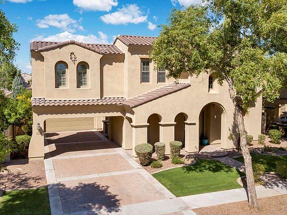 The gourmet kitchen boasts granite countertops, stainless steel appliances, a large island with breakfast bar seating, and a walk-in pantry. Ideal for both everyday living and entertaining. Upstairs, the generous primary suite includes a spa-like ensuite with dual vanities, separate shower and soaking tub, and a roomy walk-in closet. Step outside to a beautifully landscaped backyard with a covered patioperfect for relaxing Arizona evenings. Additional highlights include a 4 car tandem garage, 6 covered spaces for vehicles, updated flooring, and access to award-winning community amenities such as pools, lakes, playgrounds, and walking trails.