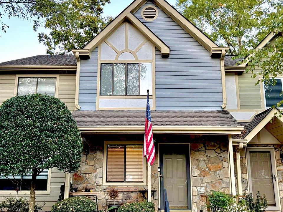Welcome to your peaceful retreat in the sought-after Raintree community! Overlooking the lush fairways of Raintree Golf Course, this beautifully updated 2-story townhome offers stunning views and a private deck. Inside, you'll find a warm and inviting layout featuring engineered hardwood flooring throughout the main level and a cozy wood-burning fireplace. The kitchen flows effortlessly into the dining and living areas through a charming arched pass-through, creating a perfect space for entertaining or relaxing at home. Upstairs, discover two spacious en-suite bedrooms with soaring cathedral ceilings and abundant natural light. The primary suite includes a recently renovated bathroom designed with comfort and style in mind.