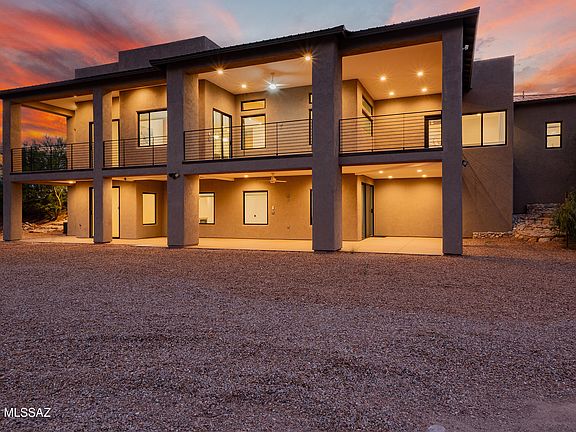 Spacious, outstanding, new (2025) custom Southwestern Contemporary in the Catalina Foothills with 4 bedrooms, 4 1/2 baths and 3 car garage, just completed. Situated on a 1.08 acre view lot adjoining lush Valley View Wash , this 3,559 sq. ft. home is light and bright, with open living spaces including great room and separate family room. Featuring modern accents, stucco exterior, multi-hued paver driveway, steel seam and parapet roofing, marquee awnings, super-quiet energy-efficient materials, this lovely new-build is a rare foothills offering. Mature saguaro and barrel cactus, with new native desert landscape and trees leads to stylish modern steel and glass front door, into the foyer. Formal dining/sitting room, den/office with expansive windows, into the truly great room with transom mountain view windows, walls of windows, soaring ceiling with 12' limestone and modern linear fireplace. Gourmet kitchen with breakfast nook, sleek modern Italian slab cabinetry, 11' quartz island and backsplash, Krause composite farmhouse sink, pot filler and custom range hood vent, Thor and GE stainless steel appliances including 6 burner gas range and large capacity French door/drawer refrigerator. Split floor plan secludes primary suite including French door access for fabulous view balcony, walk-in closet with built-in cabinetry, custom shelving, palatial primary bath with dual floating vanities, modern soaking tub, large walk-in shower and dedicated tankless water heater. Expansive lower level walkout family room/guest living space includes kitchenette with gorgeous leather-texture quartz countertops, under-counter fridge and microwave. Soaring 10' and 12' ceilings, 8' doors, pet-safe engineered oak hardwood floors throughout and solid oak stairs with steel handrail. Three high efficiency HVAC units, whole-house water treatment system, re-circulating hot water pump, high capacity electrical panel, designer finishes, an abundance of storage and so much more. See to appreciate this rare find.