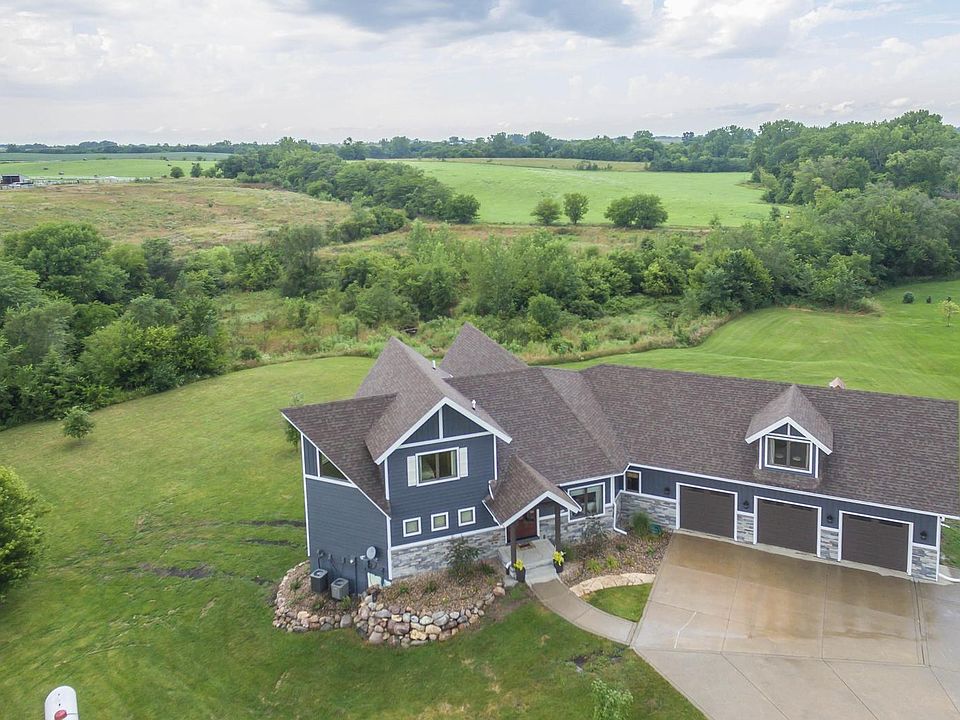 Unparalleled 9 acre property 20 min to Ames or Des Moines, all hardsurface roads. Located across from White Oak winery, this property also adjoins a 20 acre association green space. Remodeled inside and out, regraded, corrected, huge 750 SF composite deck added. Heavy insulated vinyl and stone exterior, 3+ car garage. Ability to build a barn, building, have animals, or just enjoy an incredible view. Walkout basement has a second stone fireplace with built-in TV, wetbar with Hickory cabinets, mini-fridge, State of the Art Theatre Room, kids library and 6th bedroom, full bath and 3/4 bath that is located right at the bottom of a stair to the garage. When you step into this property, prepare to fall in love. Open Pine beamed vaulted ceiling, many big windows to gorgeous countryside, creek and woods. Main floor master with walk-in tile shower, main floor laundry and mud room. 2nd bedroom or office on main floor. UPstairs is a loft area and 3 bedrooms and full bath. New lighting, flooring, plumbing, paint, hardware, appliances, mirrors, front door, zoned heating and cooling. High speed fiber optic cable. Built in storage systems in garage stay, built in shelving in kids library stays, theatre room equipment and seating is extra. Everything has been touched.