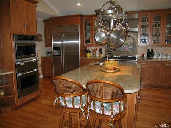 Toluca Lake with Burbank Schools and Services. Home built in 2008. Home has approx. 2300 sf, office is 264sf, with air/heat, Set up with cable and TV wiring. Home has 2 Master suites, large Chef's Kitchen w/3 ovens, 6 burner Thermador gas range w/grill. Hickory cabinets w/roll out drawers, 8ft x 4ft granite center island w/salad sink, hanging pot rack, skylight and separate walk in pantry. Separate laundry area with washer/dryer. Blt in Refrig. Kitchen opens into a large Family Room with fireplace and 14ft square bookcase centered with a large screen TV. The Fam. rm French doors open out to 10ft x 30ft Redwood Decked Porch and beautifully landscaped rear yard leading to oversize 2 car garage and office,opening to rear alley. Auto sprinklers. All rooms in home have Oak Flooring with exception of the baths and the entryway, which are richly tiled. MBR has large walk in closet with pull down ladder to attic space. Baths have spa tubs and separate showers. M/bath has ddble sinks and lge shower with body sprays. The living room has a gas fireplace and the spacious Dining room is centered with a crystal Chandelier The kitchen has an area with a desk and cabinets. AD# (B129)