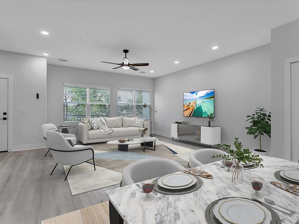 Welcome to this newly built 2024 townhome located in South Tampa's desirable Westshore Palms neighborhood near Beach Park. Zoned for the sought-after Grady, Coleman, and Plant school district, this beautifully designed interior unit offers over 2,000 square feet of modern living space with 4 bedrooms, 3.5 bathrooms, and a spacious 2-car garage. Positioned at the back of the property, this unit offers added privacy, no street exposure, and a quiet setting free from drive-by traffic. Inside, the home features luxury wood plank vinyl flooring throughout and energy-efficient double-pane windows on all levels. The first floor includes a two-car garage with a storage closet, and a guest bedroom with a full bathroom ideal for use as a home office or private suite. On the second level, you'll find a stunning open-concept kitchen with quartz countertops, abundant cabinetry, and high-end stainless steel appliances including a French door refrigerator, wine fridge, range with hood, and microwave. A closet pantry and separate utility closet provide extra storage, and a convenient half bath is located on this floor. The large living and dining area is filled with natural light from oversized windows and offers access to a petite balcony for fresh air. Upstairs on the third floor, the primary suite features a walk-in closet and a luxurious bathroom with a walk-in shower, double vanity with quartz countertops, and LED-lit mirrors. This level also includes two additional guest bedrooms, a shared full bathroom, and a laundry closet with a full-size washer and dryer. Two pets are allowed with landlord approval. Non-smoking only. This is a rare opportunity to live in a brand-new home in one of South Tampa's most convenient and desirable locations, just minutes from Westshore Plaza, International Mall, Tampa International Airport, and major highways.