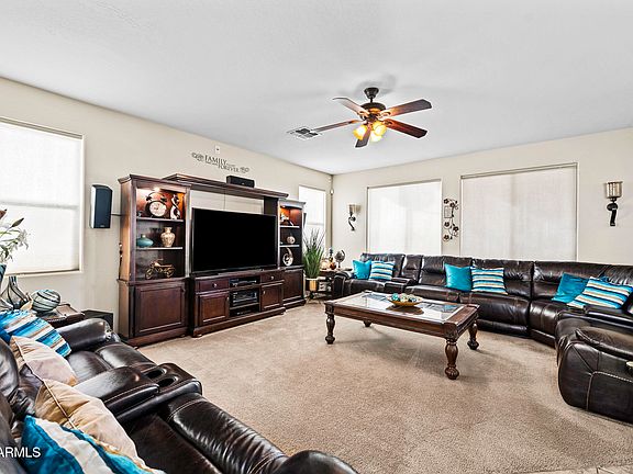 Resort-Style Amenities with this Stunning 4-Bedroom, 3-Bathroom Home. This gorgeous home features a heated resort-style pool and backyard, fire pit, screened patio with automatic electric screens in a covered entertainment area. Add to the fun inside, with a game room, a pool table, bar and dart set. A theater style living room with room for EVERYRONE. Enjoy new AC and furnaces (2021) for year-round comfort. Spacious master suite with double sinks, separate bath and shower, and a California Closet. Plus, a separate bedroom and full bath downstairs for guests or family. GE washer and dryer with steam feature, oak banister, epoxy garage flooring, and closet organizers throughout. Furnishings and most artwork convey. Don't miss out on this exceptional home! Come see today! b Homestead Community - Maricopa, AZ