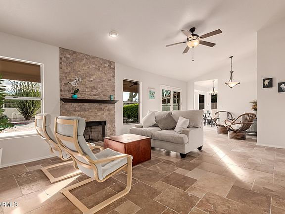 Location Location Location! What a beautiful single level home with pool and spa, backing to the desert greenbelt, within Tatum Ranch. You will enjoy this clean and updated home with vaulted ceilings, flowing out to your spacious and serene outdoor setting. This home has been updated with natural stone flooring, matching granite countertops, cabinets, stainless appliances, lighting, fans, fixtures, throughout. The stacked stone fireplace is a focal point for entertaining. The pool and spa can be heated with a newer heating system, and take comfort in a new Roof and HVAC system. This Home truly is a gem of a neighborhood within 5 miles of Desert Ridge. Close by you will find grocery, shopping, eateries, golf, hiking, the Sonoran Desert. Hurry Over, this find will not last.