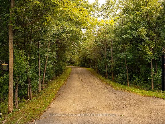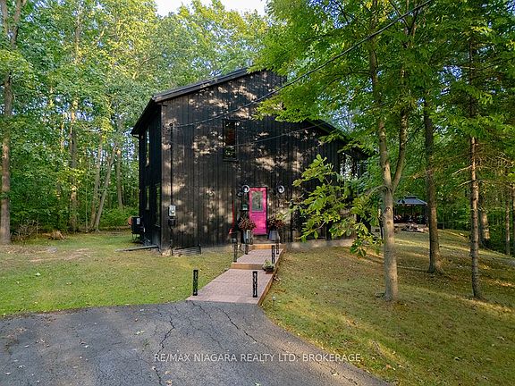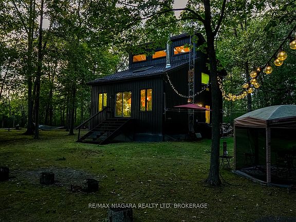 Tucked away in the woods beside the Stevensville Conservation Area, this 3-acre retreat has been cherished by the same owner for over 30 years. A private, paved driveway winds through the trees, opening to a clearing where the home sits quietly surrounded by tall trees and the sound of a gentle creek.Board-and-batten siding, clean rooflines, and natural surroundings give the home a rustic-modern cabin feel perfectly at home in the forest. Inside, the 1,662 sq.ft. layout is open and airy, with vaulted ceilings and floor-to-ceiling windows that frame the forest like living art. A brick accent wall and wood burning stove add warmth, while a mix of wood, tile, and neutral carpets keep the finishes grounded in texture and character. Sliding doors extend the living space outside, where twinkle lights, a gazebo, a circular firepit and a matching shed echoing the homes style together create an inviting atmosphere for quiet nights or creative gatherings.Upstairs, a spacious loft-level primary suite offers privacy with its own 2-piece bath. The full basement provides practical storage and laundry.Artists, musicians, and creatives will find more than just a home here - its a studio in the forest, a place to work, rest, and create in complete privacy. For anyone who values space, seclusion, and distance from neighbours, its a rare chance to own one of the areas most private and protected settings. All of this, while still being just minutes to Stevensville, Crystal Beach, Ridgeway, Niagara Falls, and major highways for easy access to both Buffalo and Toronto.A truly one-of-a-kind opportunity to make the forest your home.