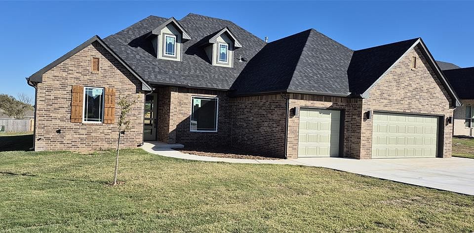 This beautiful home offers the perfect balance of quiet living and easy access to the city. Step inside to a spacious living room with open cathedral ceilings, a cozy fireplace, and charming stained wooden beams. The open-concept kitchen flows seamlessly into the living space, featuring a large island, floor-to-ceiling cabinetry, and a roomy walk-in pantry. Upgraded quartz countertops throughout the home combine beauty with durability. The luxurious master suite is accented by stained wooden beams and a stylish barn door leading to the spa-like master bath. Here you’ll find a soaking tub, walk-in shower, dual vanity, elegant tilework, and a large window that fills the space with natural light. Enjoy the outdoors on the covered back porch with scenic countryside views. Complete with a built-in gas line for your grill and TV hookups, it’s ideal for relaxing evenings or entertaining friends. Builder offers $7,500 towards upgrades and up to $5000 in buyer closing costs.