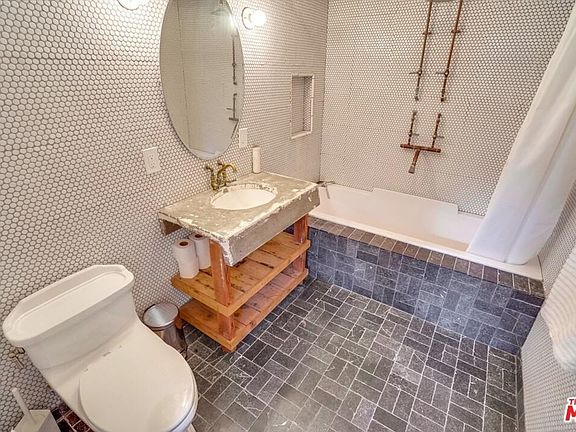 Bathroom is Completely Tiled with Artsy Flair plus Unique Sink Vanity & Shower Features