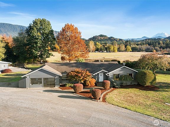 Welcome Home to Your Entertainer’s Dream! STUNNING Mt. Rainier views & serene creek frontage from this spectacular custom-built home on 4.28 acres. As you enter, you'll immediately notice attention to detail & craftsmanship that define every inch of this property. 2,500 sf home features 4 bed, 2.5 bath, bonus room, open-concept kitchen, dining area that flows seamlessly into a spacious living room with cozy wood fireplace & home theater. Primary suite includes a walk-in closet and a private en-suite bathroom. Enjoy beautifully mature landscaping, expansive covered patio, 48x48 commercial shop, Greenhouse, RV parking, full fenced & NO HOA! Experience the perfect blend of privacy, beauty & functionality — truly an entertainer’s paradise!