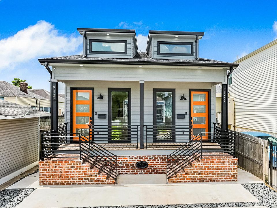 This home has 11-foot ceilings and it has an open floor plan with the living room, kitchen, and dining room, which offers an ideal option for entertaining. The kitchen features white quartz countertops, black stainless steel appliances, and plenty of cabinet space. The New Orleans monthly rental has porches on the front and side, along with a spacious backyard.