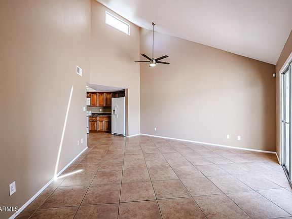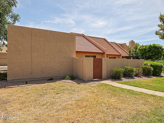 This immaculate 2-bedroom townhome won't disappoint! Located in a highly desired community, this perfectly situated end unit features a 2-car attached garage with keyless entry. Enjoy the large grassy common area and guest parking right in front of the home. Enter through the private courtyard with a security screen door. The updated single-story layout boasts a spacious great room with a soaring ceiling and a kitchen with beautiful granite counters and ample cabinets. Recent upgrades include ceiling fans in the two roomy bedrooms, fresh paint and laminate flooring. The community offers walking paths, greenbelts, a swimming pool, and a ramada, making it feel like resort living. Conveniently close to ASU West, freeways, and shopping in a prime North Phoenix area