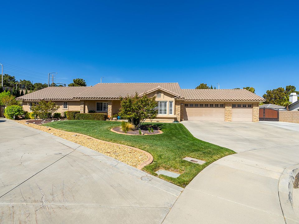 **Stunning single story home in West Palmdale with PAID SOLAR & RV Parking!** This home sits at the end of a cul-de-sac, nestled in a highly desirable area on .44 acres. Pulling up you find the 3-Car garage & gated RV parking on the side with 50/30/20 Amp Receptacles in a Sub Panel. Plenty of room for your vehicles, RV, trailers, and much more! Step inside and you are greeted by the formal living room & dining room just off to the right. Moving forward you enter the open floor plan with den and spacious kitchen. The kitchen boasts plenty of cabinet & counter space with newer stainless steel appliances. Stroll down the hallway and you find the 4 spacious bedrooms and 3 full bathrooms. The primary bedroom has an en-suite bathroom with separate soaking tub & shower for you to relax & enjoy. Invite your friends and family for fun-in-the-sun this summer in the massive green lush back yard with surrounding trees to give you privacy. Don't hesitate to schedule your private showing today.