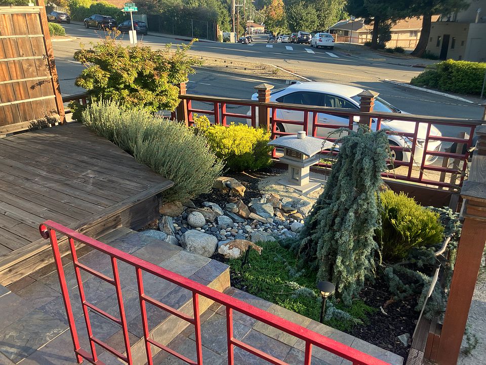 This charming two bedroom one bath duplex unit has an amazing Japanese garden in front with your own overlooking deck.New carpet, new flooring in kitchen, refinished hardwood floors in living room, new AC unit and fresh paint throughout. Includes laundry on site, storage in attic, and 1 off street parking space.The unit also has a small side yard.No pets please.Garbage is covered in the rent.