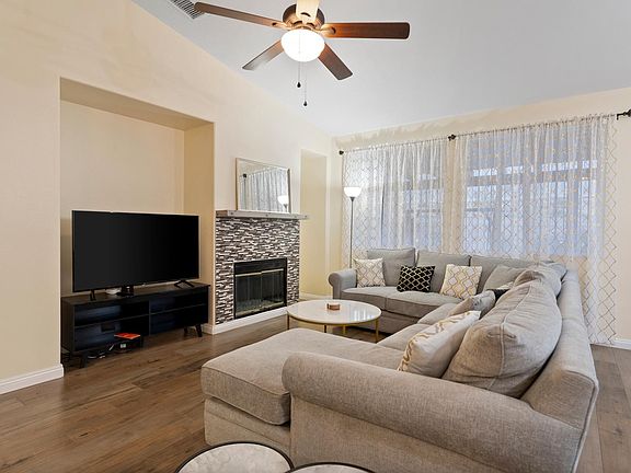 Step into the inviting embrace of this delightful single-story retreat, where every detail is thoughtfully designed to make guests feel at home! The journey begins with an appealing exterior, adorned with freshly landscaped frontage featuring lush sod and welcoming mulch. As you enter, revel in the airy and spacious ambiance, crafted by vaulted ceilings that seamlessly blend indoor and outdoor living. Experience comfort at every turn with thoughtful upgrades, to the welcoming tile and wood laminate flooring. Ceiling fans in every bedroom and the family room ensure a cozy atmosphere year-round.