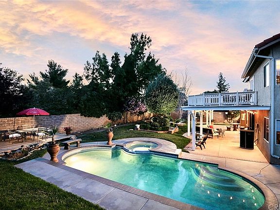 ***LIVE BEAUTIFULLY*** Upgraded 5 Bedroom Pool & Spa Estate w/ A Park-Like Backyard! 2 Bedrooms Downstairs. No HOA & NO Mello-Roos! Beautiful Custom Built Door Invites You Inside. The Formal Living Room & Formal Dining Room Features Upgraded Hardwood Flooring, High Ceilings, Plantation Shutters, And A Stunning Fireplace w/ Custom Stone & White Mantel. The Remodeled Kitchen Showcases Granite Counter-tops, Tile Backsplash, Travertine Flooring, A Center Island, Bar Area, Stainless Steel Appliances, NEW Lighting, And Windows Looking Out To The Backyard. The Downstairs Offers 2 Bedrooms & A Renovated Bathroom w/ Backyard Access To The Pool. The Gorgeous Wood Stained Wrought Iron Staircase Leads Upstairs. The Masters Suite Boasts Vaulted Ceilings, Its Own Private Balcony, 2 Closets, NEW Tile In The Bath Area, His & Her Sinks, & A Separate Tub & Shower. NEW Patio Doors Leads To The Backyard. The Park-Like Private Backyard Features A Covered Patio, Grass Area, Firepit, Mature Trees For Shade, And A Sparkling Pool & Spa! Located In A Quiet & Peacefully Community, And Offering A 3 Car Garage, This Home Is A Must See!