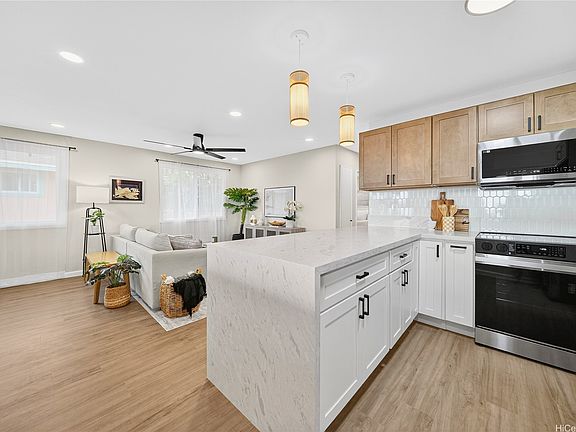 Fully Renovated Multi-Dwelling Home in Desirable Salt Lake – No HOA! This 4-bedroom, 4-bath home offering flexibility and modern living on a 5,000 sqft lot. Features a 2-car garage, street parking, and a spacious 320 sqft covered lanai with a view of Pearl Harbor. Upstairs includes 3 bedrooms and 2 full baths with a huge primary suite featuring a dual vanity and shower, a remodeled kitchen, and space to add a fourth bedroom. Downstairs offers 1 bedroom, 2 full baths, a wet bar, and room to add a second bedroom—ideal for multi-generational living or rental potential. Renovations include new split A/C throughout, new luxury vinyl plank flooring, fresh paint, new washer, dryer, refrigerator, oven, and microwave, updated kitchens and bathrooms, new water heater, and a new fence. Home also includes 40 owned solar panels with net metering for energy savings. Conveniently located near Aloha Stadium, Ice Palace, Navy Exchange, Target, and the airport.