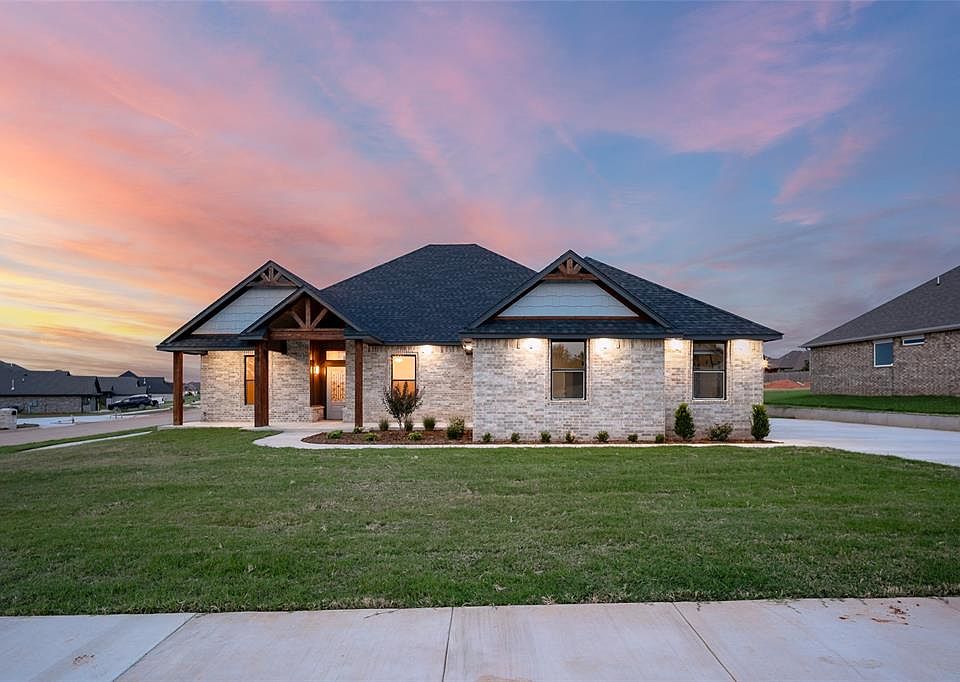 The 3-car garage includes a walk-in safe room/storm shelter, offering added peace of mind. Step outside to enjoy the large, covered patio, extended concrete driveway, and the spacious corner lot, providing ample outdoor space and curb appeal.