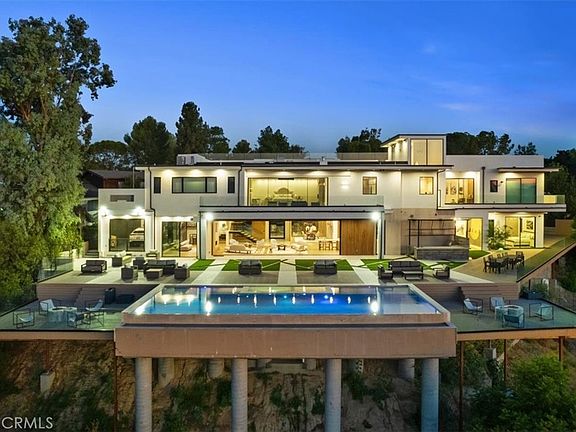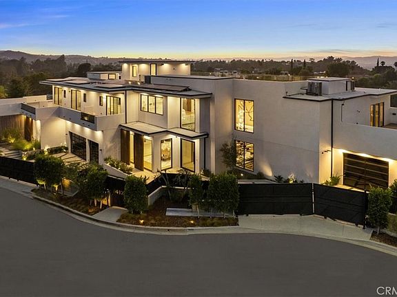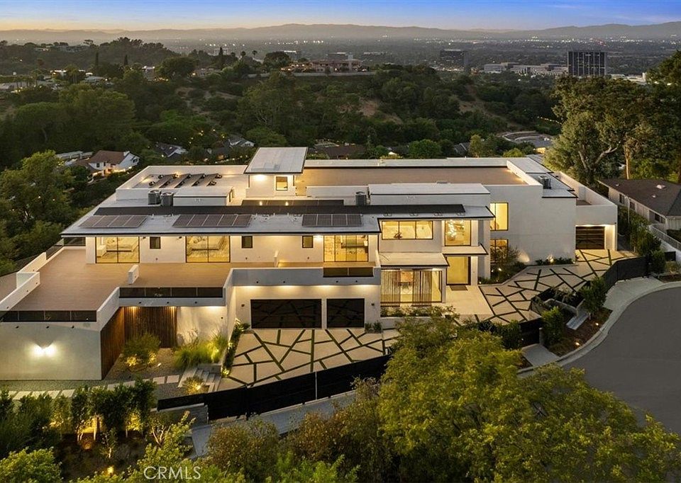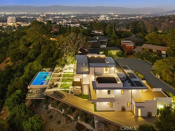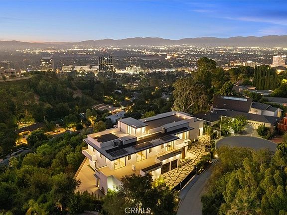 Perched in the prestigious ROYAL OAKS OF ENCINO on a CUL-DE-SAC find a MODERN ARCHITECTURAL MASTERPIECE with BREATHTAKING CITY and VALLEY VIEWS. Boasting 7 bedrooms and 9 full bathrooms across 11,500 square, on an almost 37,000 sqft lot. Offering Exquisite detail and refined finishes this estate artfully brings elements of wood, stone and glass together in a textural symphony. A grand entry welcomes guests through a 10-foot glass revolving door into a foyer adorned with high ceilings and modern chandeliers. The expansive living spaces feature floor-to-ceiling 40-foot glass motorized doors, creating a seamless indoor-outdoor flow and showcasing views and glimpses of skyscrapers in the distance. Throughout the home, engineered oak, onyx and limestone floors complement custom wood-paneled walls and wainscoting. The stunning gourmet chef's kitchen is equipped with top-of-the-line Thermador appliances. The residence includes amenities such as a high-end home theater, a state-of-the-art gym, a home office, a fully remote controlled Smart Home System, Fully Paid Solar, automatic blinds ensuring convenience and sustainability. Travel up the floating staircase or elevator to the spacious primary suite and the remaining 4 ensuite bedrooms. The exquisite primary suite has a large private sun deck with Stunning City lights view, dual showroom-style walk-in closets, a spa-like bathroom with dual steam showers and vanities, a private sundeck off the shower with a sitting tub. Enjoy sweeping views from an almost 2000 sf of rooftop deck. Perfect for entertaining, the backyard includes an infinity pool and spa and outdoor bbq station with a roof cover.