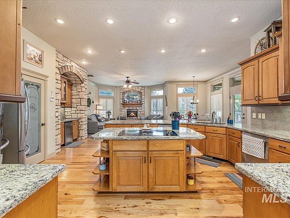 Total Turnkey Single level with all the bells and whistles on a full acre! Entry with etched glass front door. Beautiful great room with high ceilings & gas fireplace. Hickory floors. Large kitchen is a treat with custom cabinets, granite counters, island for prep work, trash compactor and walk in pantry. Unique stonework surrounds full wet bar and wine refrigerator, With Separate Family room, there is a Formal dining that can be an office. Master is large with gas fireplace, double jetted tub and walk in shower with double shower heads. Backyard is a haven for fun and entertaining! Inviting in-ground pool, 2 covered patios, built-in gas BBQ and mounted TV. With over 2800+sf in the main house and 1480 SF detached 4 car garage/shop heated/cooled and Epoxy floors, makes for exceptional spaces. There is also a 680 sf finished apartment over shop with full kitchen, living, bedroom and bath. Raised garden beds and Shed with loft.