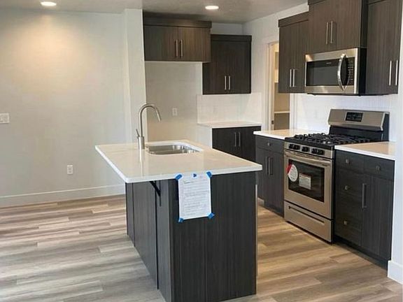 The thoughtfully designed layout features a spacious primary bedroom on the main floor, complete with a luxurious en-suite bathroom that boasts a beautiful double vanity and a generous walk-in closet, equipped with a convenient washer/dryer hookup. The heart of the home is the modern kitchen, outfitted with sleek stainless steel appliances and a stylish bar area, perfect for casual dining and entertaining.