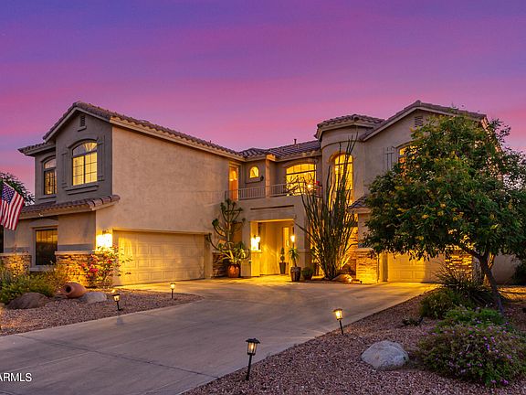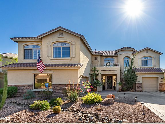 LISTED WELL BELOW $995,000 APPRAISAL...Luxurious 5 bed, 4.5 bath residence in highly desired Dove Valley Ranch . Beginning with a stunning façade w/stone accents, manicured desert landscape, 3-car garage parking, & a welcoming front porch that will warm your arrival! Inside you will find plenty of dining & living area w/polished stone floors, large windows, dazzling light fixtures, and neutral bright palette throughout. Continue into the lovely family room, w/its impressive stone fireplace which flows into the gorgeous kitchen that is worthy of a chef; comprised of staggered cabinetry w/a walk-in pantry, granite counters, built-in appliances & an island complete w/a breakfast bar. You'll love the primary bedroom, featuring a lavish ensuite w/dual sinks & large walk-in closet. (CLICK MORE) Enjoy delightful views of the neighborhood from the charming balcony, and don't forget about the cozy loft or den/office, boasting wood-look flooring and plantation shutters! Finally, the wonderful backyard includes a covered patio, extended seating area w/a gazebo, built-in BBQ, lush grassy area, a convenient storage shed, and a sparkling blue salt water pool, perfect for the warm summer days!