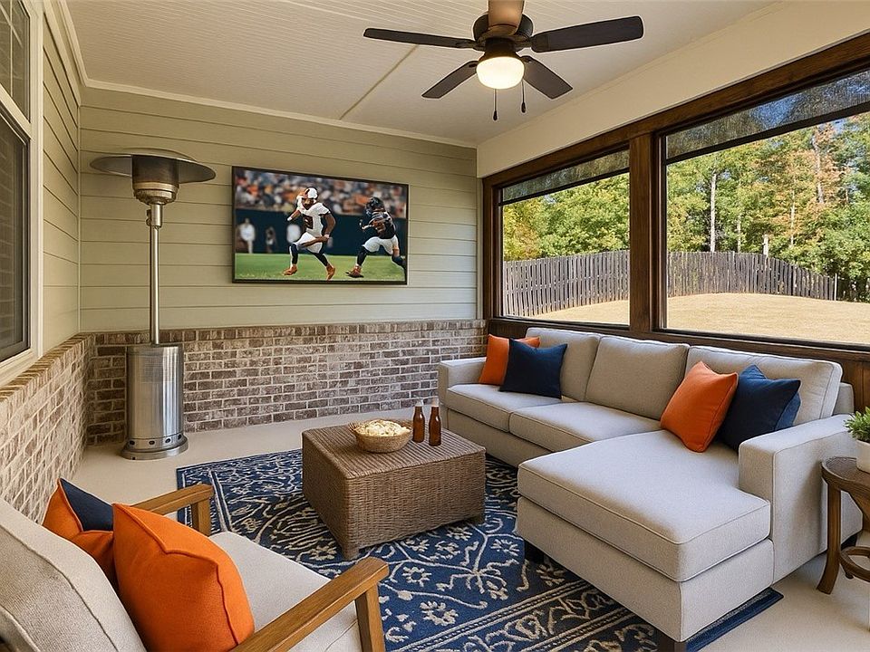 The generous primary suite features a soaring ceiling, two spacious closets, and a spa-style shower with built-in seating and a garden tub. Everyday living is a breeze thanks to the mud room with bench and the laundry room located just inside the home by the door of the insulated two-car garage. Recent updates make it move-in ready: the interior and front porch were freshly repainted, and the custom screened-in porch was newly stained—perfect for morning coffee or game-day evenings. Outside, a fenced backyard backs to wooded views for privacy and play.