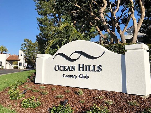 Detached home, over 2300 sq. feet, with an open & spacious feeling, is on the top of a slope, has an eastern exposure in back (no home right behind it), and sun coming in through the windows & skylights. Property is in Ocean Hills Country Club, the 55+ paradise in coastal North County. This popular "Antibes" floor plan has a spacious primary bedroom downstairs, another bedroom (w/ bath), same size, upstairs. Plus, it also has a family room and breakfast room (or office, if you like). Many with this model live in it like it's a 1-story, and let guests stay in the upstairs bedroom. Tile flooring downstairs, except in the bedroom. Laundry room leads to the 2-car garage. Kitchen has plenty of counter space, gas range, recently painted cabinets, and stainless steel refrigerator & dishwasher. Living room has a fireplace, wet bar, and recessed lights. Slider in dining room leads to a wonderful fountain outside. Handsome brick front patio, and back patio has brick accents and wrap-around overhang. Downstairs bedroom has double door entry, attractive carpeting, added recessed lights, and shutter-like closet doors. Primary bathroom has beautifully tiled tub, shower and countertop. Half-bath at base of stairs, which lead to the upstairs landing area (great for desk), and great second bedroom, featuring a walk-in closet, balcony and bathroom with granite countertops and modern open shower. Storage space under stairs. Two AC's and furnaces. All this in gated & guarded OHCC, which has RV parking, an 18-hole golf course, tennis & pickle-ball, swimming pool, huge clubhouse, and lots of activities and common interest clubs.