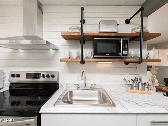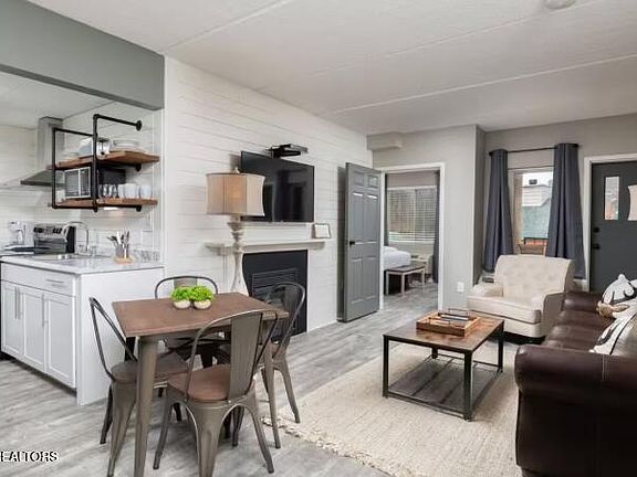 This chic condo is complete with custom barn wood doors, barn wood & shiplap accent walls, 3 TVs, full sized & fully equipped kitchen, gas fireplace in living room, private balcony and modern decor!
