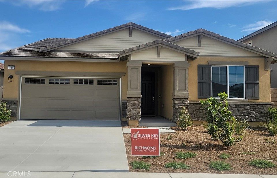 Single story home, the Alexandrite Floor plan offers 4 Bedrooms & 2 Baths. 10' Center meet slider at the Great Room. Ceiling fan pre-wire in Great Room, study and all bedrooms. Recessed Can Lights at Great Room and Owner's Bedroom. White Thrermofoil cabinets throughout with 42" upper cabinets at Kitchen. Upgraded Quartz counter tops at Kitchen. Wood Laminate Flooring in all living areas, tile floors in bathrooms and laundry room, upgraded carpet & pad in all bedrooms and closets. Walking closet at Owner's Bedroom. Garage service door. Covered Patio with Ceiling pre-wire. Gas Stub@ Patio for future BBQ, etc. Residents will appreciate easy access to I-215, State Route 74 and South Perris Metrolink Station, as well as shops and dining at Perris Crossings Shopping center.