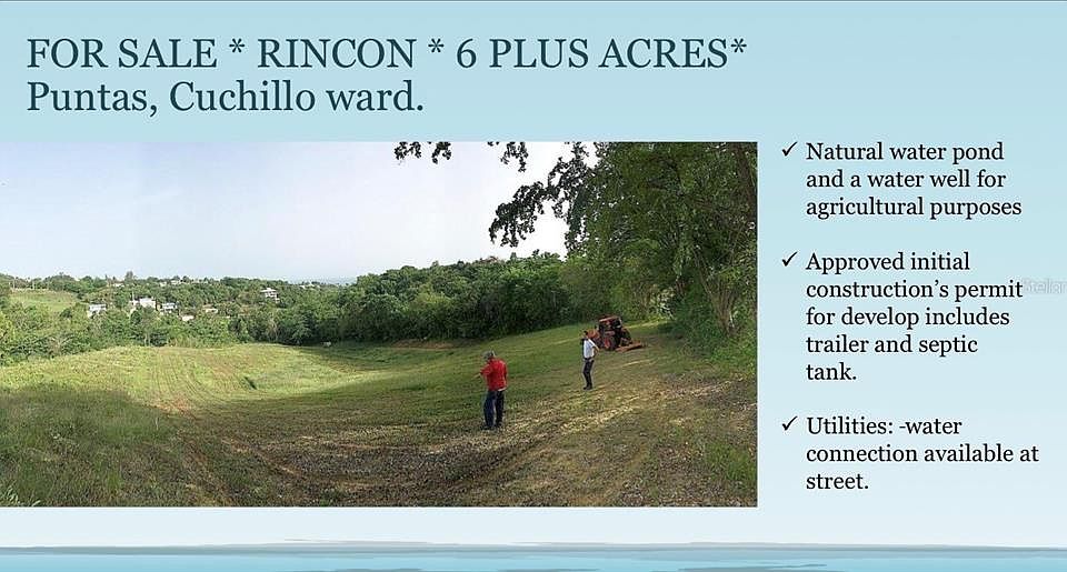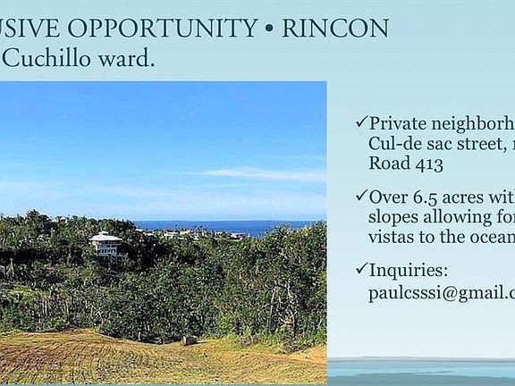 One or more photo(s) has been virtually staged. RINCON AMAZING LAND Private neighborhood. Cul-de sac street, right off Road 413 Over 6.5 acres with soft slopes allowing for different vistas to the ocean. Oversized lot with unique features • Upper lot area cleared, gentle slope • Lower lot area features a trail through amazing vegetation & seasonal stream • Water connection available at street. Rincon is a beautiful coastal town known for its stunning beaches, vibrant culture, and laid-back lifestyle. There's something for everyone, from surfing enthusiasts to nature lovers! Rincon is a popular destination for those looking to invest in a piece of paradise. With its warm climate, friendly locals, and array of outdoor activities, Rincon is the perfect place to call home or to have as a vacation retreat.