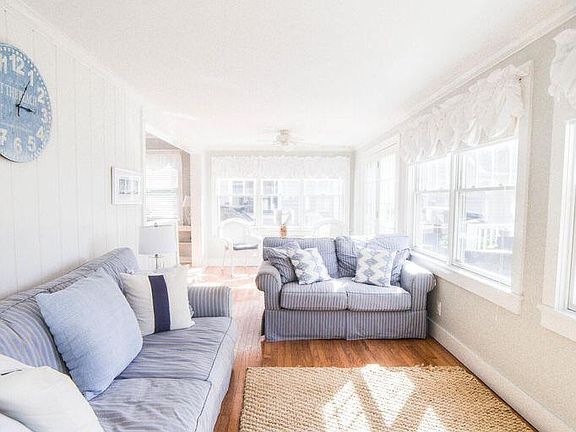 SUMMER - Updated classic Bay Header home located only a block away from the beach and the center of town. Well-maintained and recently renovated, this home retains its charm while also providing modern amenities including central air conditioning and heat, keyless entry lock, high speed Wi-Fi, tankless water heater and next-gen thermostat controls. The home is set back from the ocean side of Main Avenue with a large private front yard. Guests can relax and enjoy sunsets on the spacious front porch featuring a fire pit and outdoor dining table. The open concept first-floor boasts a large living room and modern kitchen with modern appliances. A bright, windowed sun porch sits just off the living room allowing for relaxation after a day on the water or at the beach. There is also a large paver patio in the rear of the home with a table and chairs as well as a private outdoor shower. The driveway allows for parking up to 4 cars. The ideal location just steps away from Twilight Lake, the ocean and the center of town.