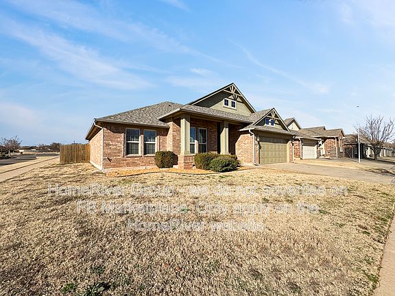 Beautiful three-bedroom, two-bathroom single-story home located on a spacious corner lot in the desirable Somers Pointe community. Zoned for Mustang Schools, this residence features an inviting open-concept layout. The kitchen showcases elegant stained cabinetry and seamlessly flows into the living room, which boasts a cozy gas fireplace and a bright breakfast nook with access to the covered patioperfect for entertaining or relaxing. Enjoy the privacy of a fenced backyard. The primary suite impresses with a vaulted ceiling and fan, a luxurious garden tub, a separate shower, and a large dual-sink vanity with abundant cabinets and drawers for extra storage. Community amenities include a splash pad and playground for family fun.
