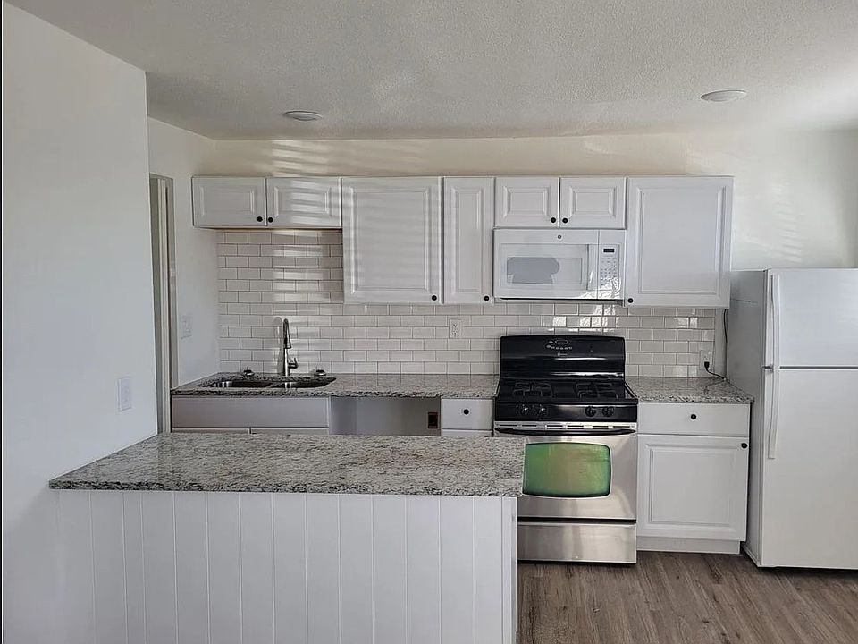 Shared yardBuilt in microwaveSubway tile backsplashesPlank and carpet flooring