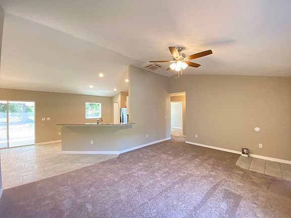 Home offers a spacious split plan with cathedral ceilings in the living room and kitchen. Kitchen design features, stainless appliances with stunning granite countertops to compliment the upgraded wood cabinetry featuring self-closing drawers and doors! You will enjoy entertaining in this kitchen with its eight foot serving counter and sliding door leading to attached screen enclosed lanai! Master bedroom is spacious and features walk in closet with a custom tiled master bath and wood cabinetry with granite counters! All wet areas are tiled with carpeted living areas. Two car garage boasts painted interior, epoxy flooring.