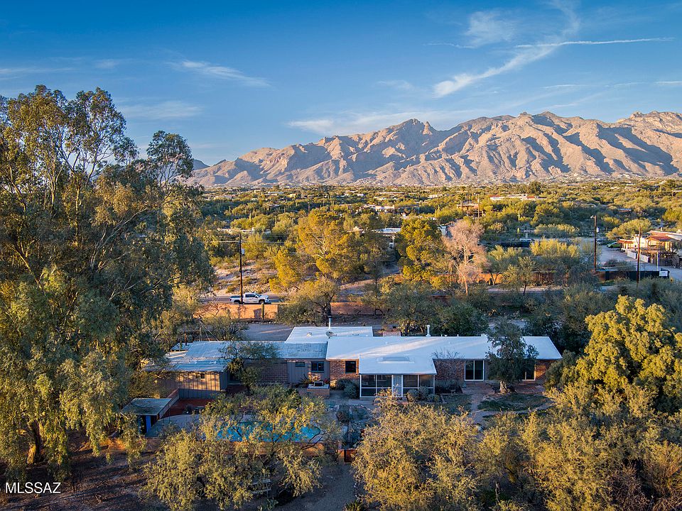 If you love a vintage vibe, and you're looking for your forever home, this is it! Situated on 3 plus acres of desert bliss, and built by Tucson-Famous Architect William Hazard, this mid-century home is a stone's throw from the Rillito, with a very productive private well. Many intact original features. Initially built as a 3 bed 2 bath, early on it was expanded off the galley kitchen to include a family/breakfast room, guest ensuite, and sizeable laundry room. Original stained concrete. Original wood floors. Vintage saltillo. Vaulted ceilings with exposed beams. Large great room with abundant light is adjacent to generous screened-in patio. Primary ensuite has it's own private patio. Two other bedrooms are light filled with sliding glass doors that open onto the back yard. The pool is located in a low-fenced area and landscaped with some natives and some exotics. Beyond the wall is pristine, a true Sonoran desert wildlife sanctuary. From the fenced yard, there is a trail to the guest house, which is also accessible by a long, long driveway. The 1990-built burnt adobe 1 bed/1 bath is 700+ sqft and has a carport, screened patio and fenced yard. When you visit the guest house, be sure to check out the well. There are flags behind the guest house to guide you there. There is plenty of room at West portion of the property to possibly install horse facilities. This is horse property by zoning. A short walk/ride to the Rillito and it's multi-use paths. 500+ square feet of storage off the main house carport can be used as-is or potentially developed for additional living space. This property is a must-see. Call for an appointment today!