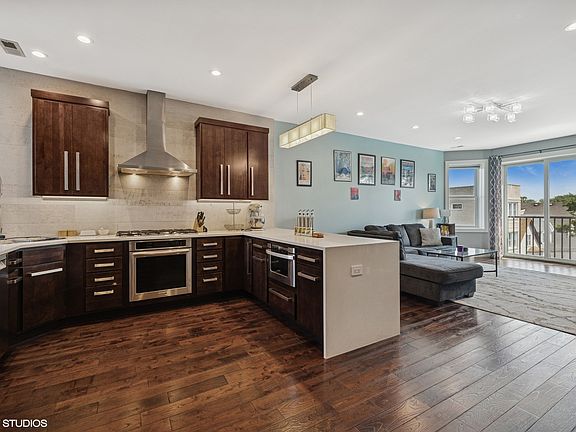 Welcome to 4130 N Kimball Ave - a penthouse two bedroom, two bathroom condo that was completely reimagined in 2015 in a vintage building to allow for modern day living. A large, open-concept living space flooded with natural light greets you when you enter and is added to buy an oversized bay window overlooking tree-lined Warner Ave. Wide-plank engineered hardwood floor spans throughout the condo and leads you into your massive kitchen offering custom Italian inspired cabinets, high-end stainless-steel appliances, and neutral quartz countertops with a waterfall edge. There is a separate dining area (also perfect for a home office!), in-unit laundry, and a gallery-style hallway that leads you to your guest bathroom and two bedrooms - one complete with a fully outfitted luxury bathroom offering a soaking tub and separate shower. A huge outdoor deck off of the primary suite offers additional entertaining space and leads you down to your two (2!) outdoor tandem parking spaces. Upstairs, a large roof deck offers stunning 360 degree views. In-unit laundry and easy access to Miko's Italian Ice makes this the perfect spot to call home.