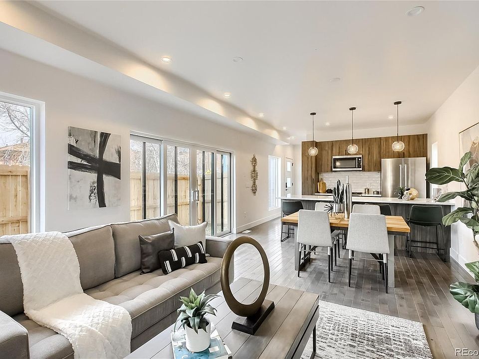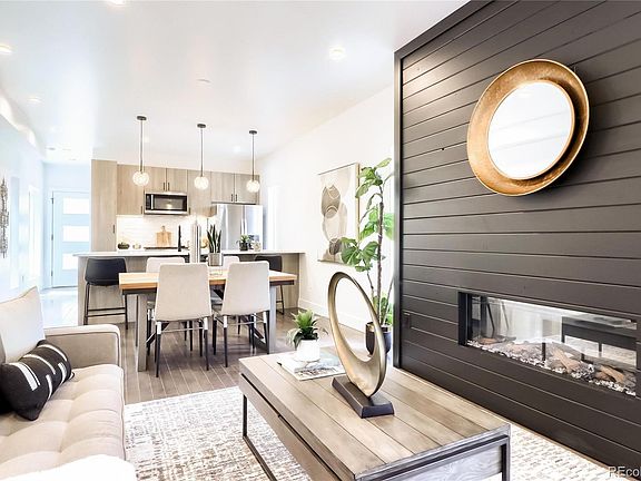 Street facing, luxe-contemporary home one block from Perry Light rail! This Workshop Colorado designed 3 bed / 2.5 bath end-property wows with forward-thinking design and upgraded finishes. Half duplex with one shared wall in stairway, lives like a single family home. Enjoy entertaining in your extensive, private outdoor space, including fenced yard off of main floor living area and third-floor covered balcony. ** The first floor encompasses an open-plan kitchen, plus living and dining room space centered around the dramatic fireplace wall and sliding glass doors to yard. Gourmet, eat-in kitchen features gorgeous Bertazzoni Italian gas stove, quartz countertops, and stainless KitchenAid appliances. ** Retreat to the second floor to relax in your primary suite with a sleek en-suite marble bath (double vanity, separate toilet room, and spa-style shower with enclosed, freestanding soaking tub), plus walk-in closet with custom built ins. This level also has a second bedroom/home office and separate laundry closet with linen storage. ** The third floor offers a sunlit bonus room with wet bar and built in wine fridge. Step through sliding glass doors to your covered, wood-clad balcony. Top floor also includes the third, primary-sized bedroom and full-bath. ** Equipped throughout with Smart-home and security features, including WiFi keypad door lock, video doorbell, Nest thermostat, and smart garage opener. Pre-wired for wall-mounted smart home panel and internet connections. Pre-wired for wifi extenders on each floor ** ATTACHED one-car garage for storing all your adventure gear. Garage is pre-wired for electric car charger ** Tankless water heater for endless supply. ** Three blocks to Alamo Drafthouse Theater, plus Little Man Ice Cream, Sloan's Lake Tap and Burger, and surrounding eateries all nearby. One block to Perry Lightrail station and Dry Gulch Park open space. Five blocks to Sloans Lake! ** Matterport Virtual walkthrough: https://bit.ly/Q13-back