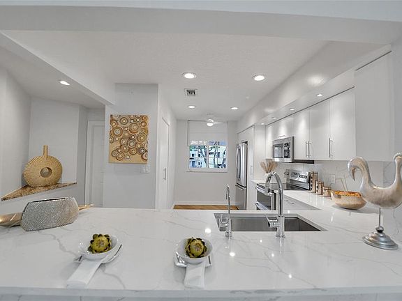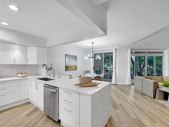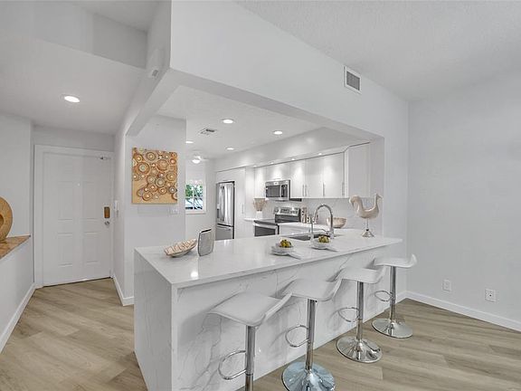 Priced to Sell. Discover 2000+ sq. ft. of gracious living in this stunning 3-bedroom, 2-bath condo located within private, gated Vizcaya - the only complex in the area with security on duty. VAULTED CEILINGS and floor-to-ceiling IMPACT GLASS WINDOWS AND SLIDERS fill the space with natural light. The wood-like LUXURY VINYL FLOORING throughout provides elegance and durability. Enjoy seamless indoor-outdoor living with a 26-ft GLASS-ENCLOSED PORCH that overlooks a serene tropical garden oasis. A second glass-enclosed balcony connects the second and third bedrooms to the luxurious primary bathroom, adding versatility and charm. The chef’s kitchen features a QUARTZ WATERFALL countertop, custom cabinetry, and brand-new stainless-steel appliances—perfect for modern living and entertaining.