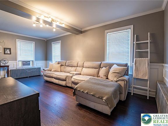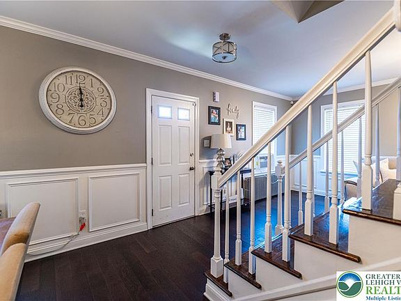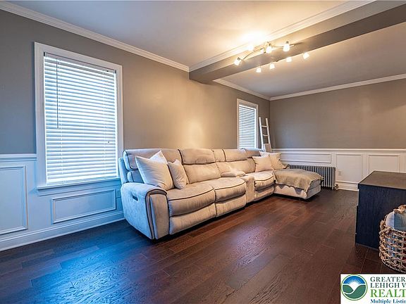 Charming 3-bedroom, 1.5-bath detached home featuring timeless character and modern updates throughout. Gleaming softwood floors flow across the main level, where a bright family room and formal dining room showcase elegant wainscoting and crown molding. The updated kitchen is a true highlight, boasting butcher block countertops, stainless steel appliances, shaker cabinets with modern hardware, a double sink, mosaic tile backsplash, crown molding, and a center island with breakfast seating illuminated by pendant lights. A convenient powder room completes the first floor. Upstairs, all bedrooms are comfortably appointed with wall-to-wall carpet, crown molding, and ceiling fans. The full bath offers stylish finishes, including 24" tile floors, a granite-topped vanity, a tiled tub/shower combo, baseboard and crown molding, and a linen closet for extra storage. Off-street driveway parking for your convenience! Fully fenced-in yard and patio allows you to soak in the colors of fall. Conveniently located close to major highways I-476 and US-22 for easy commute, Egypt Memorial Park, Lehigh Carbon Community College, shops, restaurants and so much more! This home beautifully blends classic details with contemporary upgrades, making it a perfect place to call home.